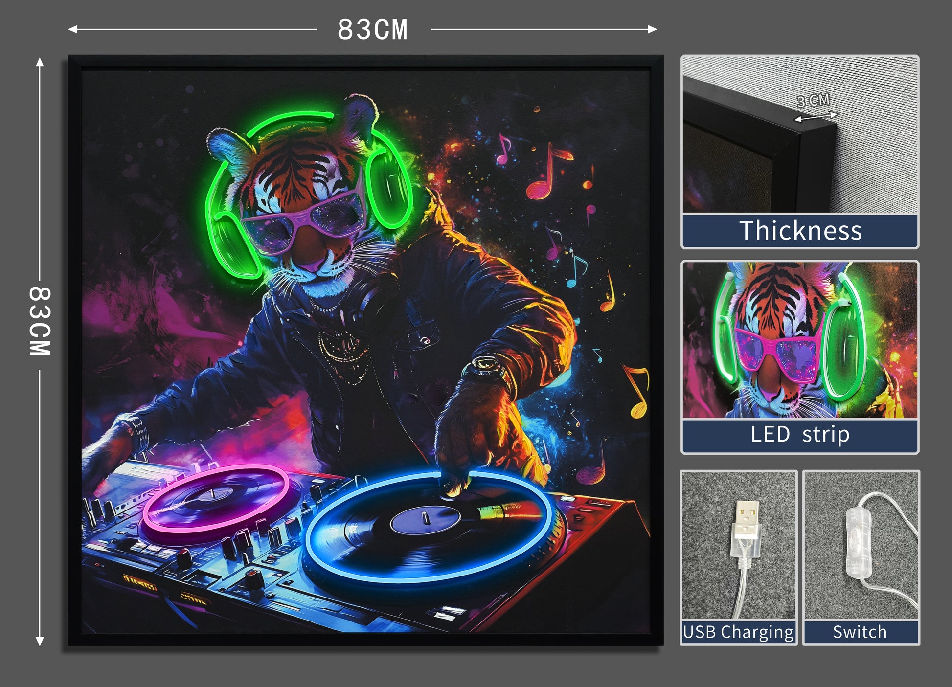 DJ Tiger LED Wall Art – Neon Music Canvas (83x83cm)
