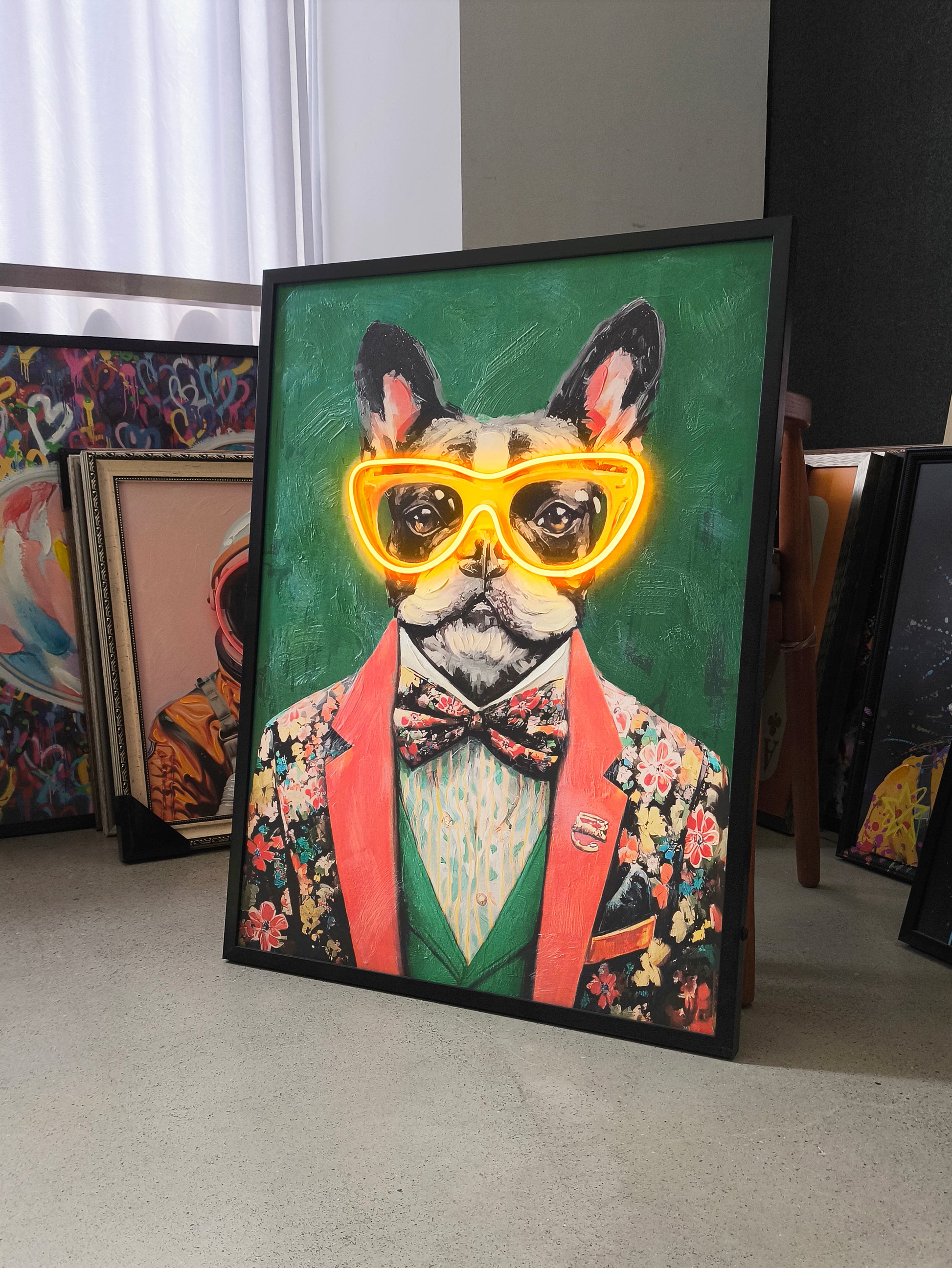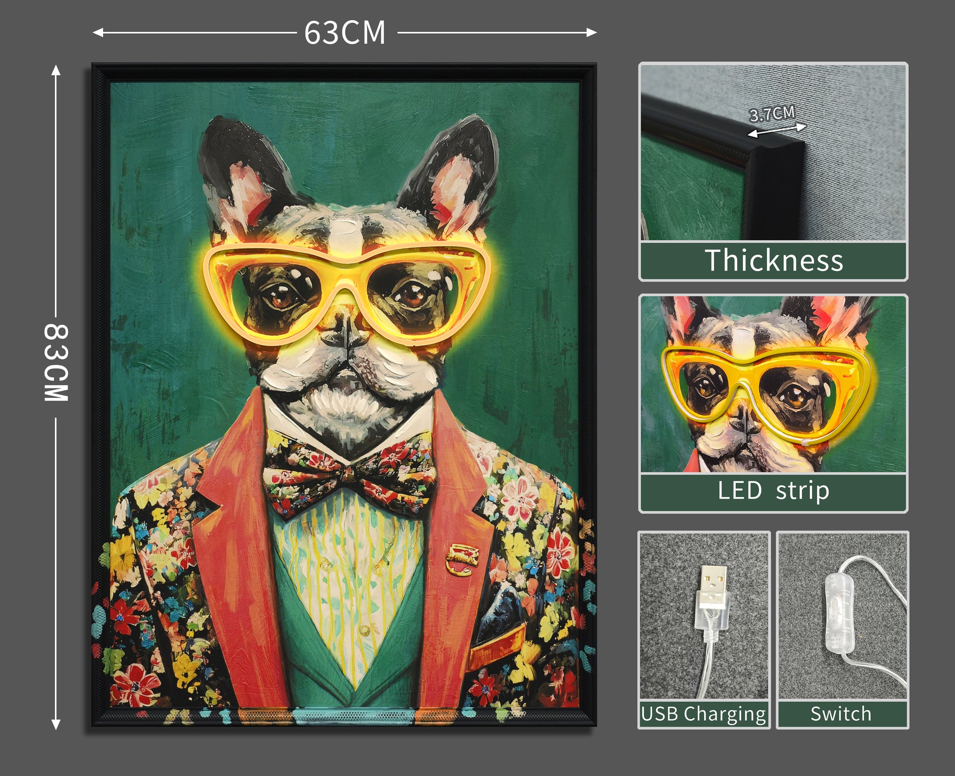 Add playful sophistication to your décor with the Gentleman Bulldog LED Wall Art. Featuring a stylish bulldog in a floral suit, patterned bow tie, and glowing gold glasses, this charming piece combines elegance, humor, and vibrant personality.