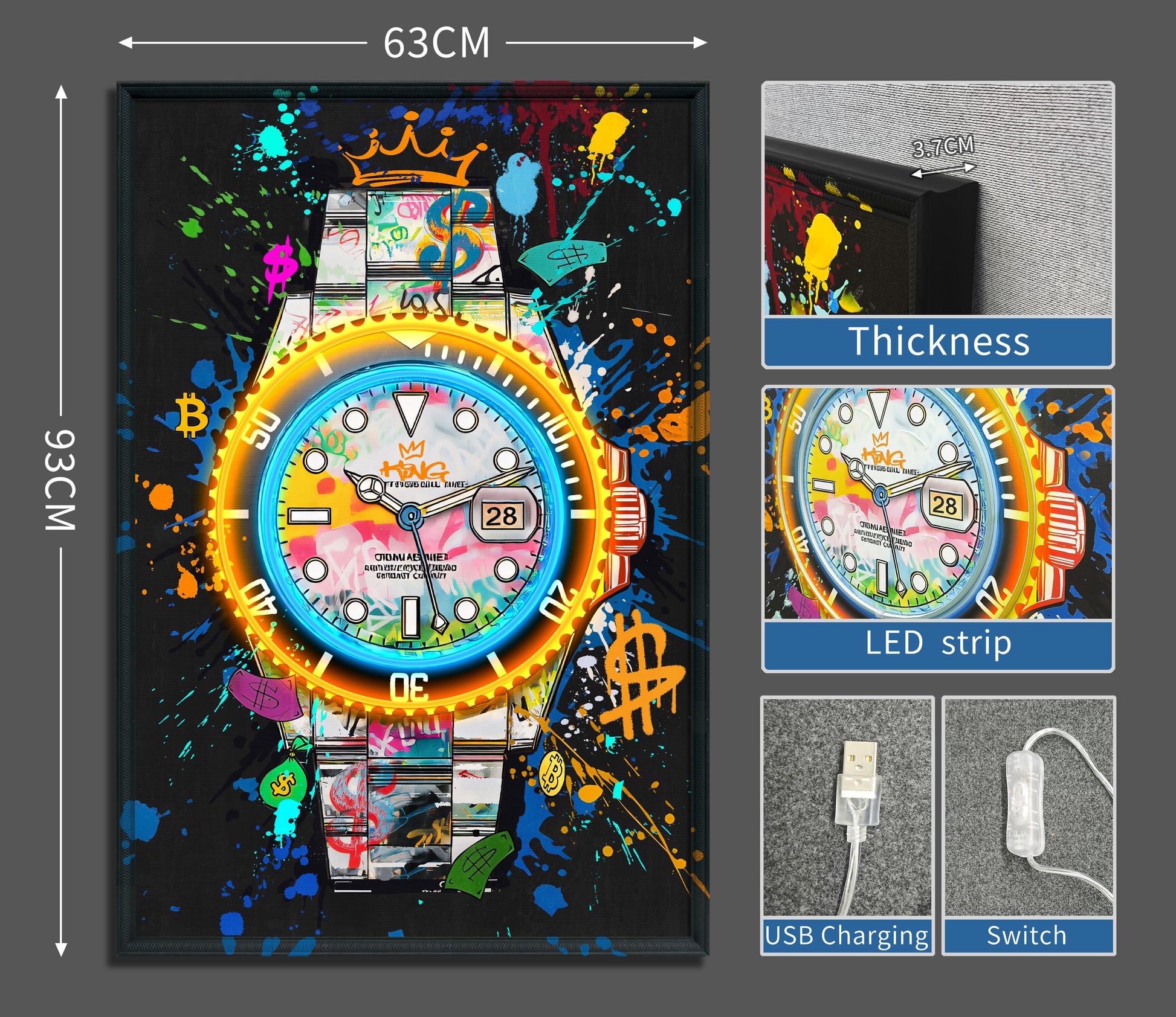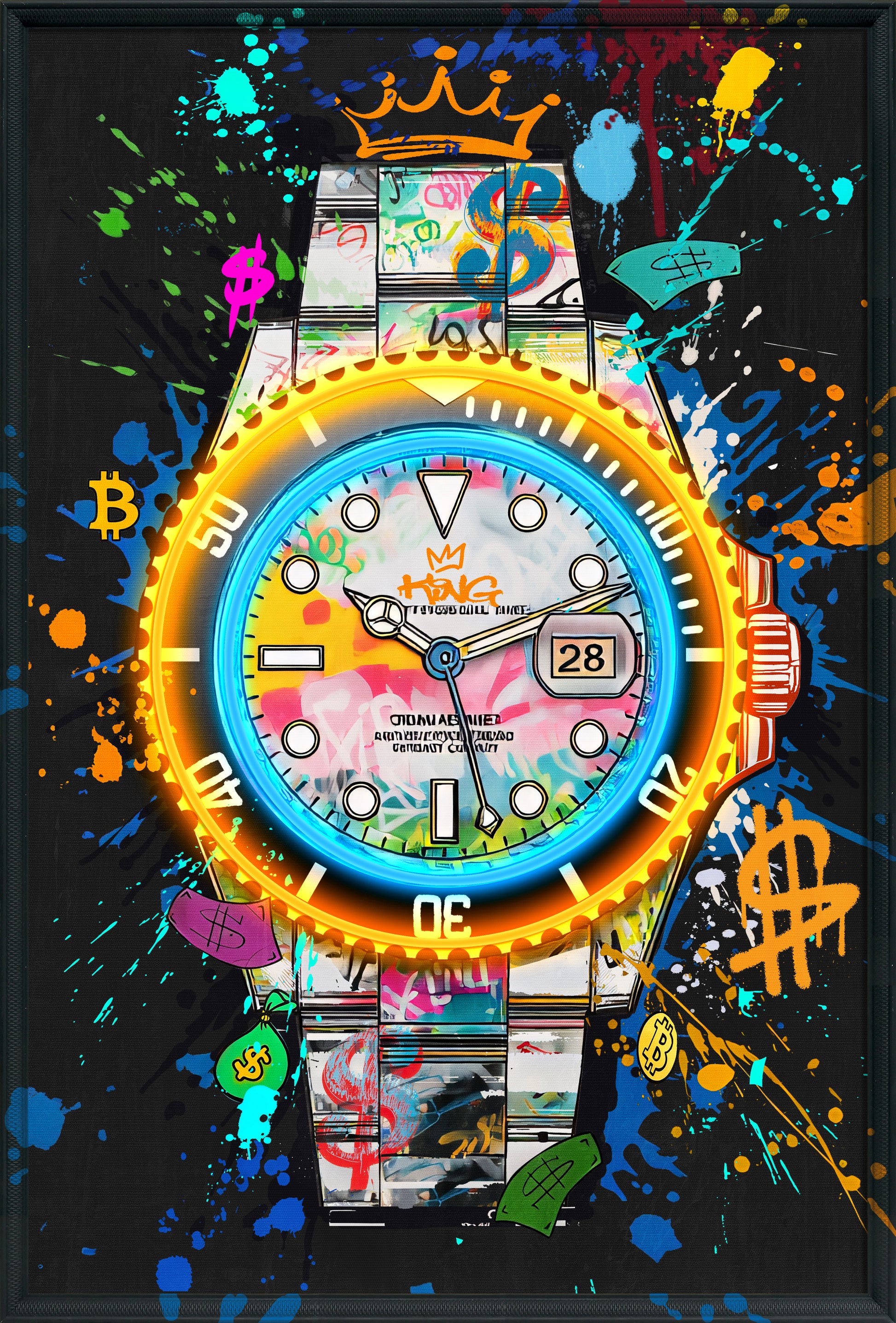 With its colorful splashes, street-art details, and glowing neon edge, this piece brings an electrifying mix of luxury and creativity to your décor. The luminous LED ring around the dial creates a captivating focal point — a true symbol of ambition, hustle, and timeless style.