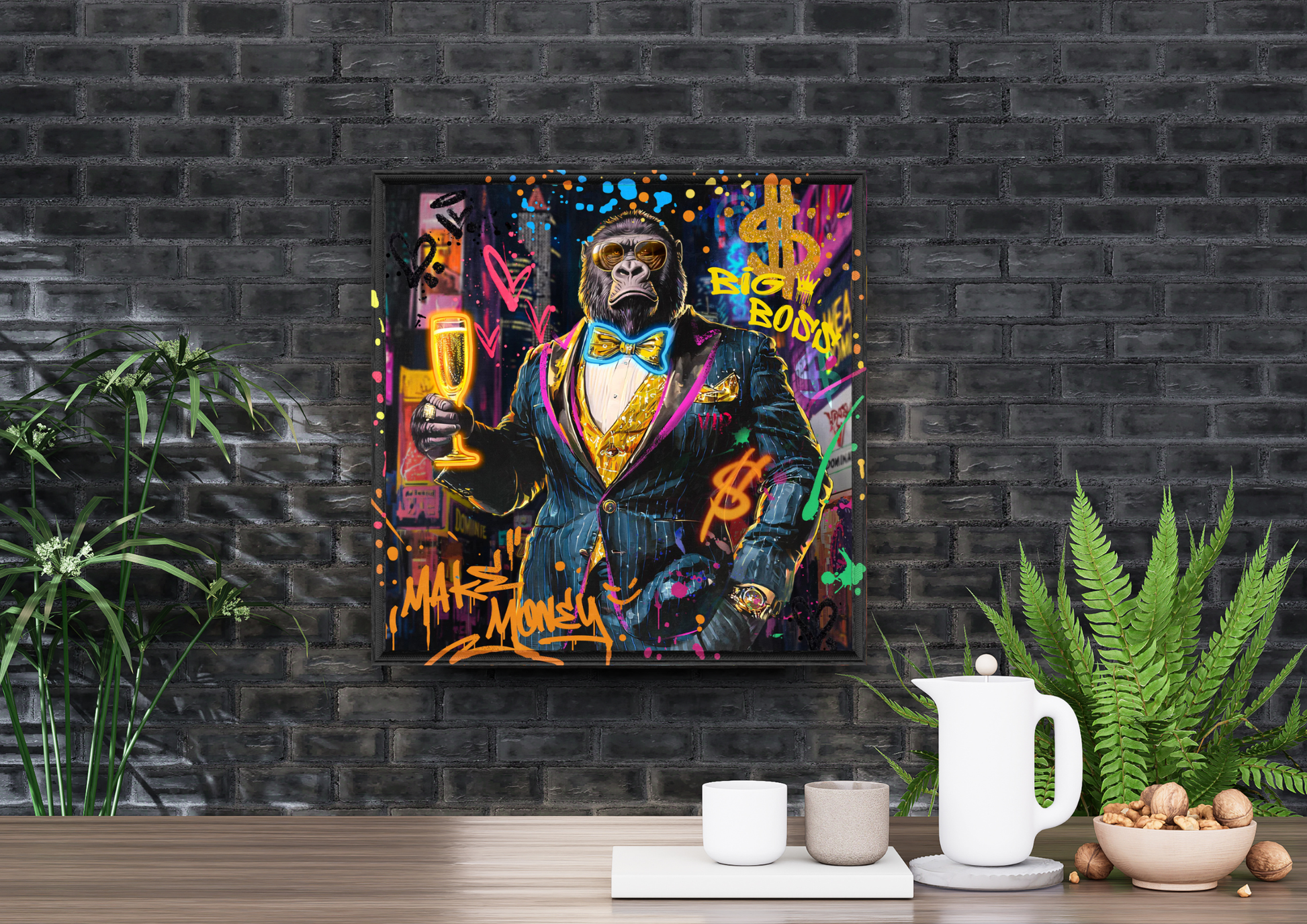 Money Boss Gorilla LED Wall Art – Neon Street Canvas (83x83cm)