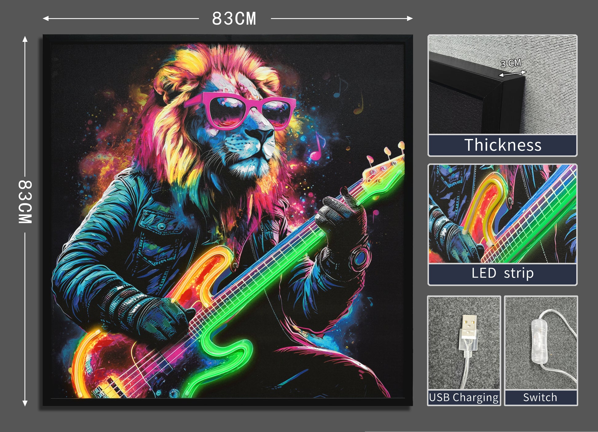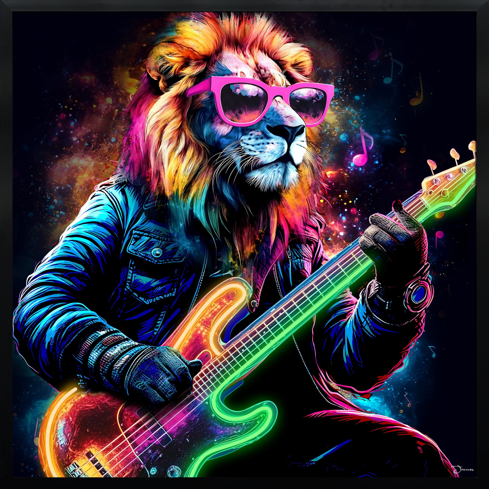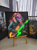 Rockstar Lion LED Wall Art – Neon Music Canvas (83x83cm)
