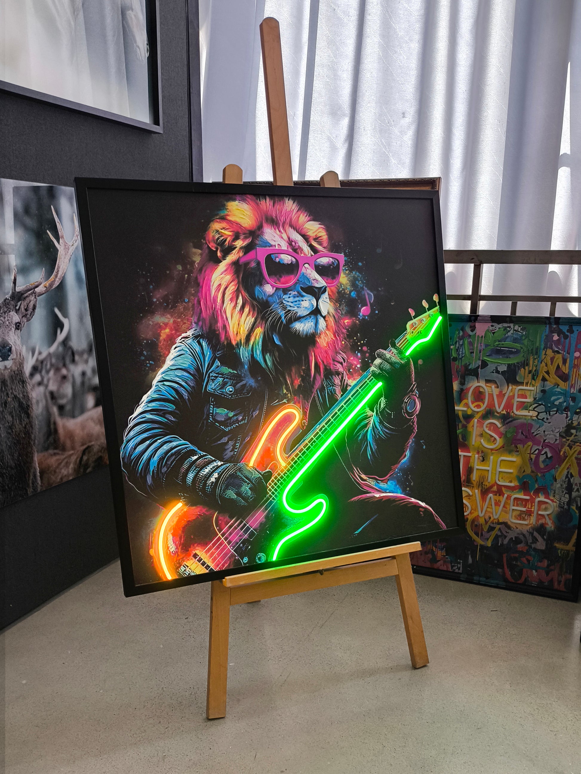 Turn up the energy with the Rockstar Lion LED Wall Art. Featuring a fearless lion rocking a neon guitar, glowing pink shades, and a leather jacket, this electrifying piece brings music, color, and attitude together in one unforgettable design.