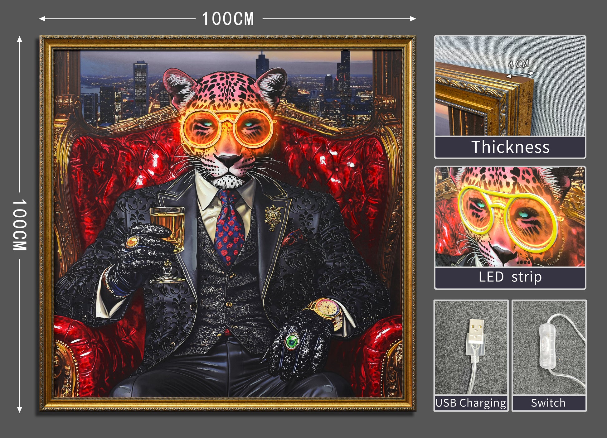 Royal Leopard LED Wall Art – Gold Glasses Canvas (100x100cm)