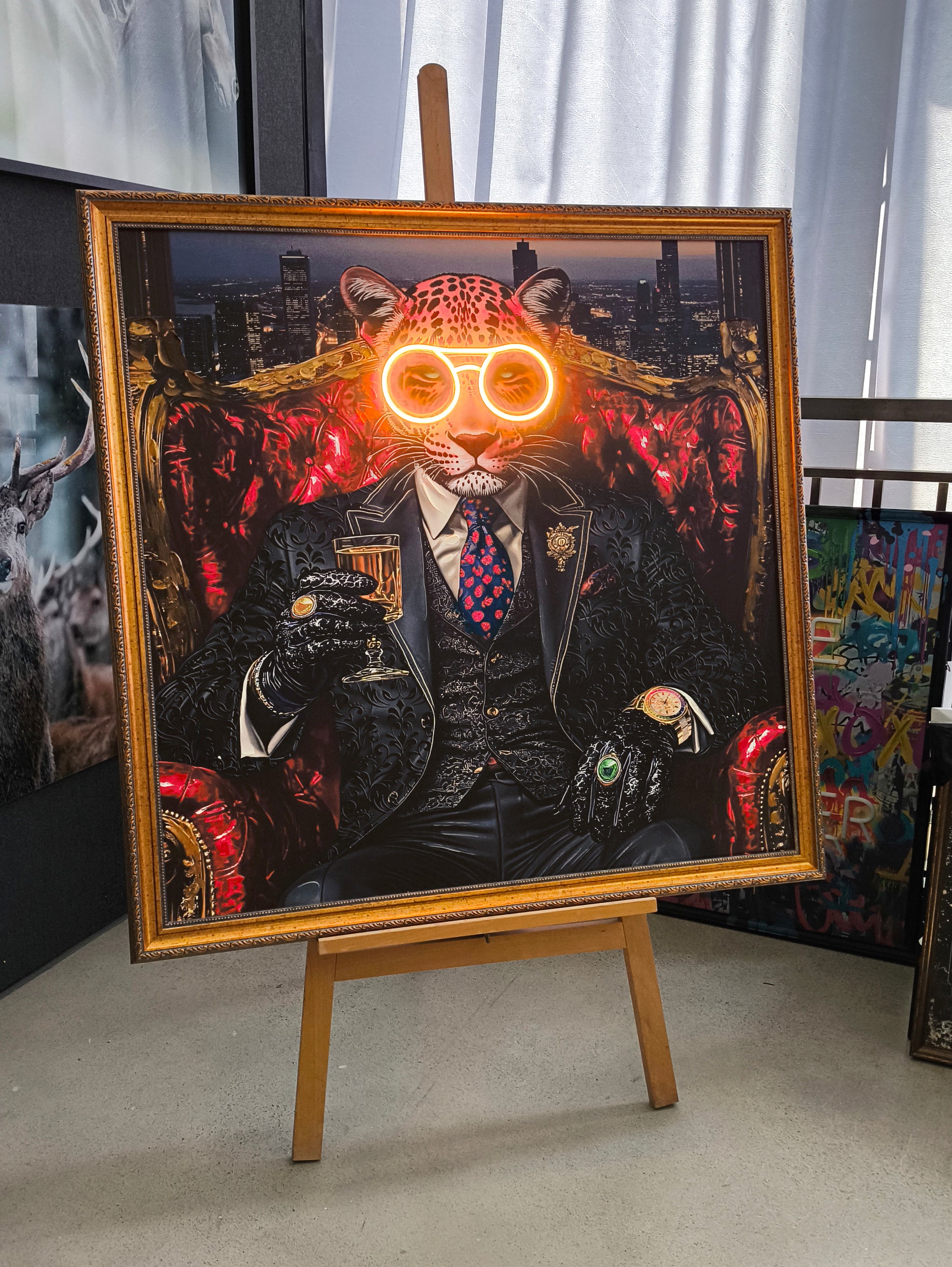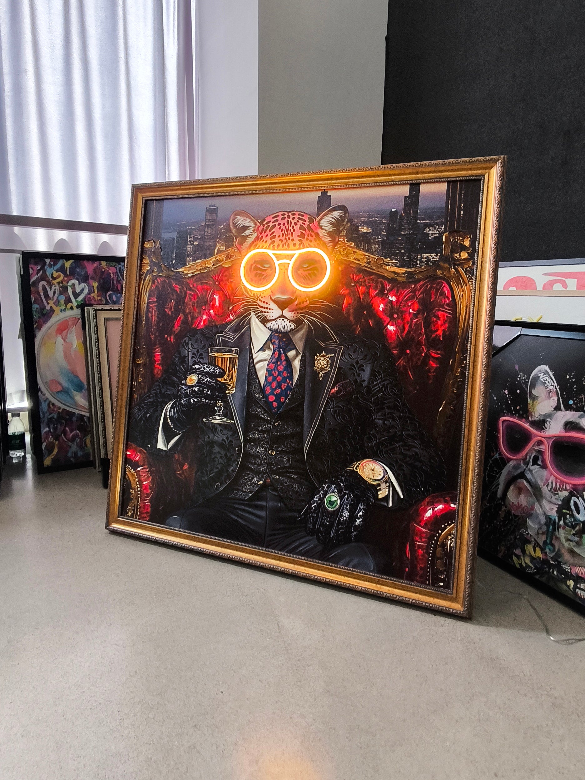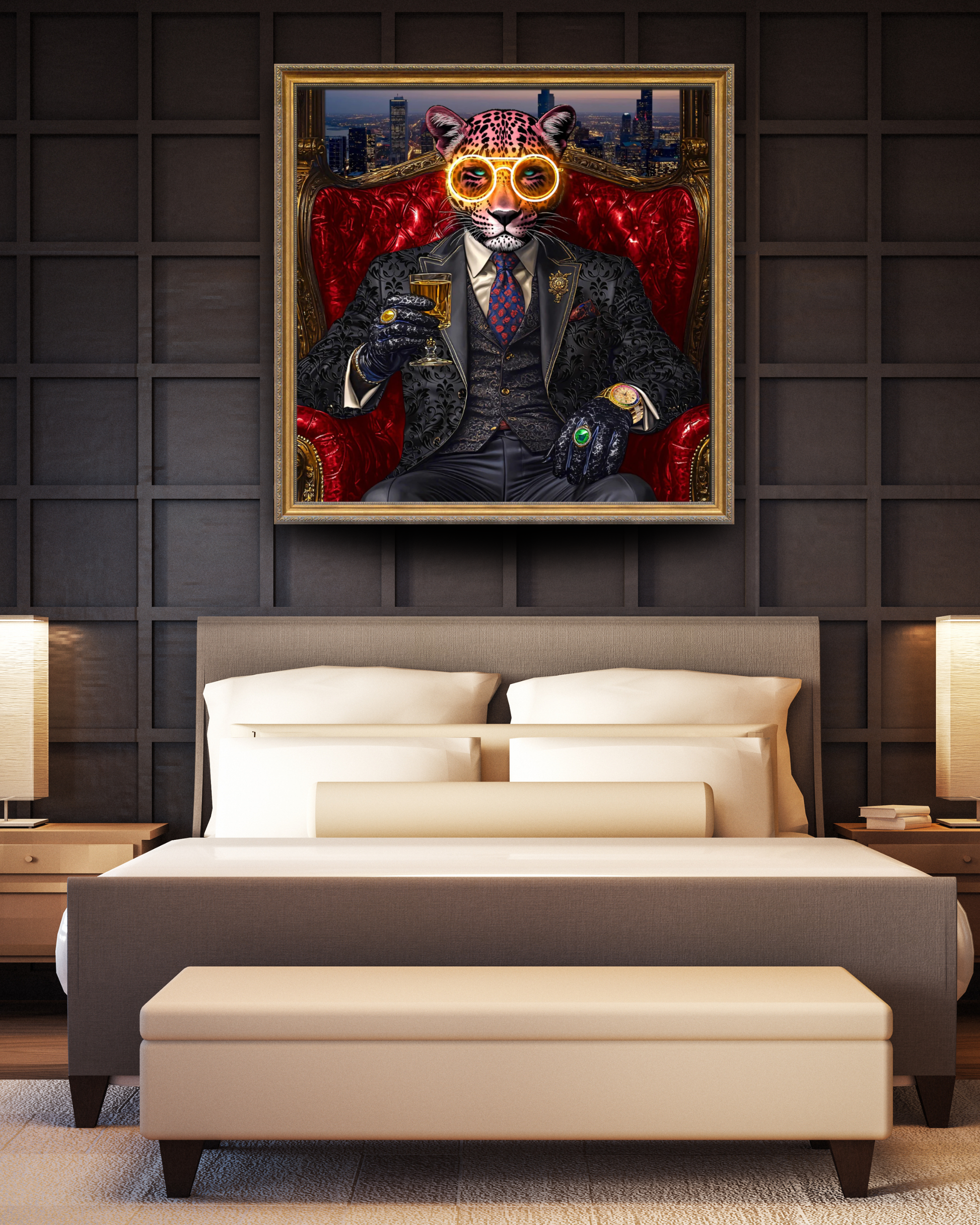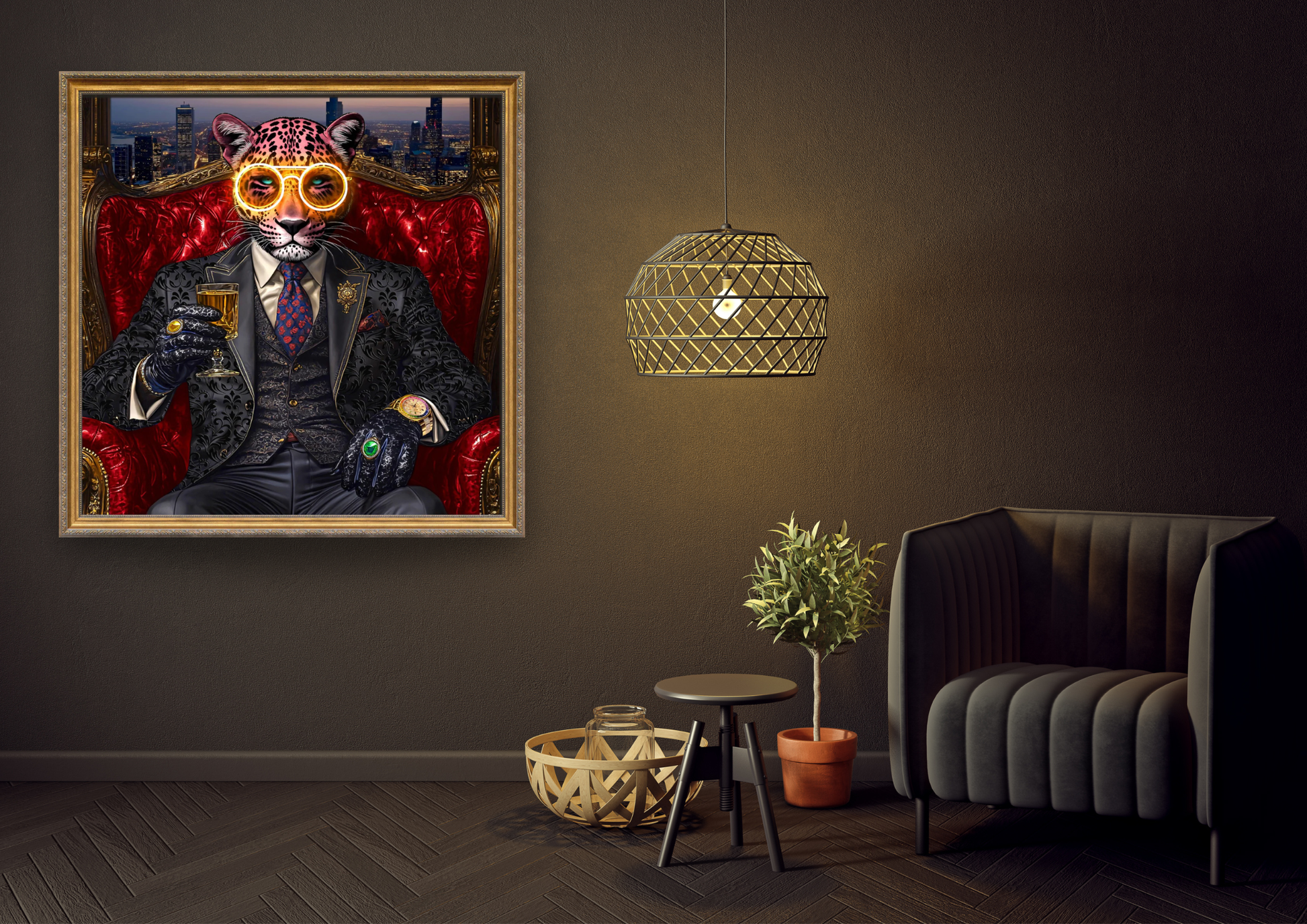 Add bold charm and electric energy to your décor with the Royal Leopard LED Wall Art. Featuring a stylish leopard dressed in a richly detailed black suit and illuminated by glowing gold LED glasses, this piece perfectly blends sophistication, humor, and modern edge.